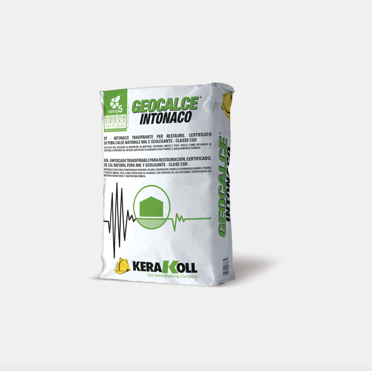 Intonaco civile traspirante certificato di pura calce naturale NHL e Geolegante® – Classe CS II. Specifico nel restauro di murature in mattone, pietrame, miste e tufo. Ideale come intonaco di finitura a spessore nei sistemi certificati di rinforzo strutturale, miglioramento e adeguamento sismico. Ideale nel GreenBuilding.GeoCalce® Intonaco è una geomalta® con classe di resistenza CS II secondo EN 998-1, per interventi su murature altamente traspiranti, ideale nel GreenBuilding e nel Restauro Storico.