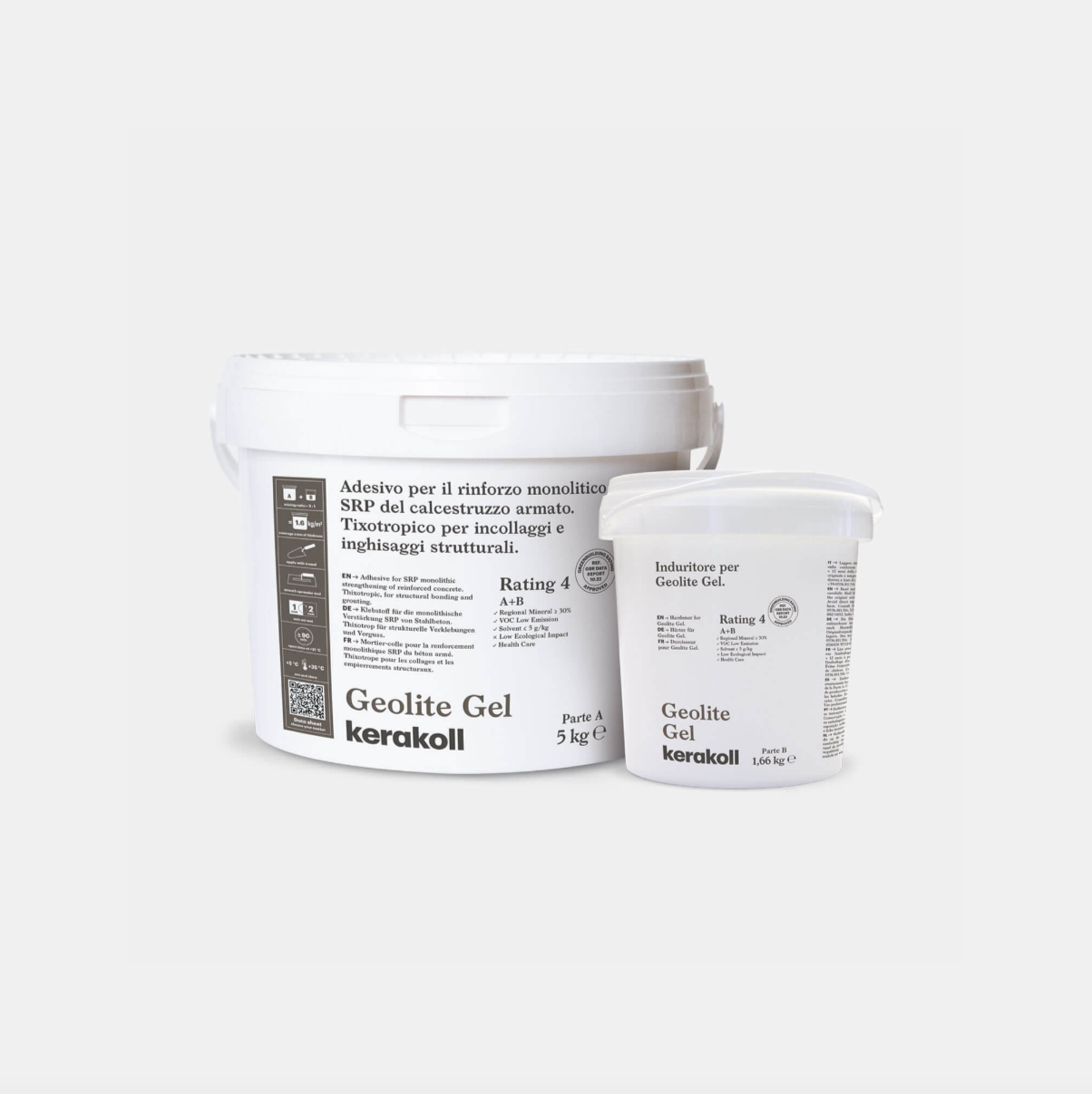 Adesivo per il rinforzo monolitico SRP del calcestruzzo armato. Tixotropico per incollaggi e inghisaggi strutturali. Geolite Gel è un sistema epossidico bicomponente in gel tixotropico per ancorare e fissare elementi metallici. Matrice organica minerale in abbinamento ai tessuti in acciaio nei sistemi certificati di rinforzo strutturale Geosteel SRP.